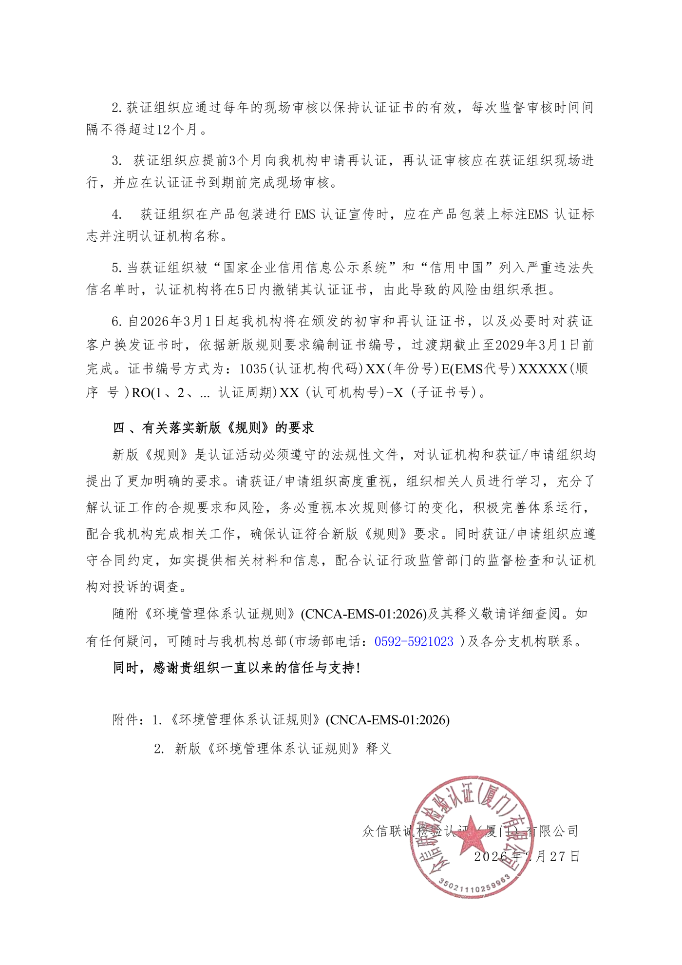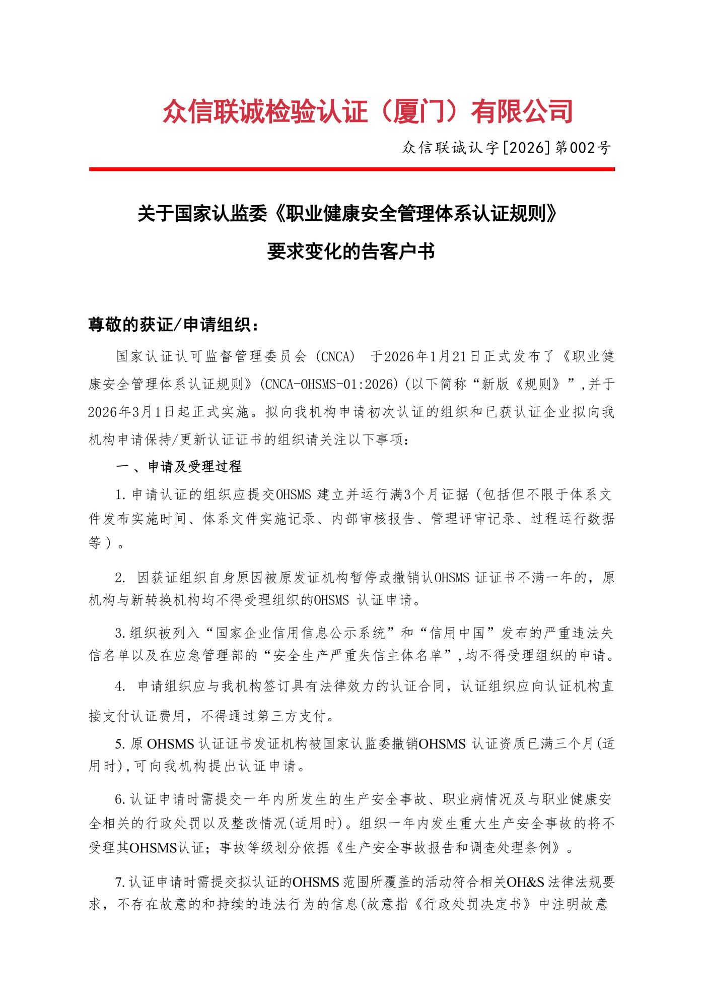 关于国家认监委新版《职业健康安全管理体系认证规则》要求变化的告客户书