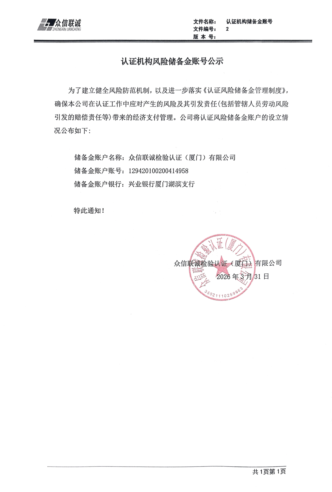 认证机构风险储备金账户公示函